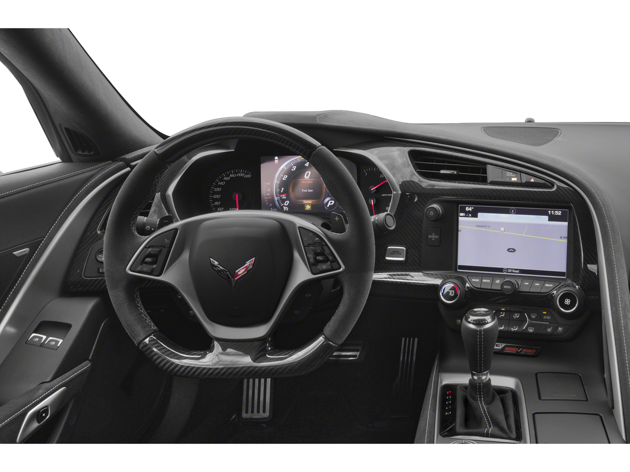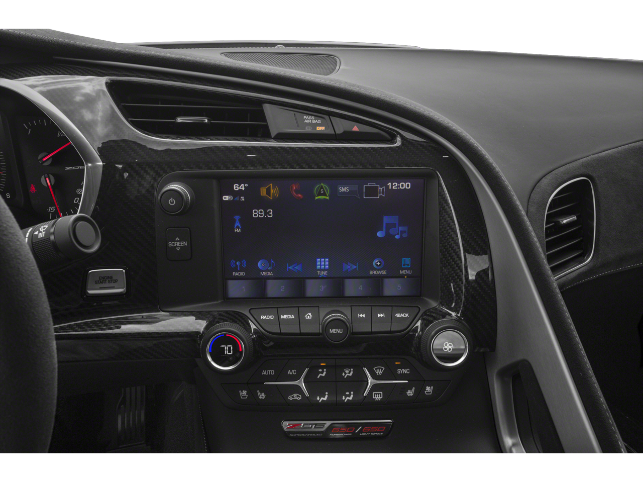 8-SPEED PADDLE SHIFT WITH AUTOMATIC MODES, Z06 BLACK-PAINTED ALUMINUM 19" x 10" (48.3 cm x 25.4 cm) front and 20" x 12" (50.8 cm x 30.48 cm) rear, REMOTE VEHICLE STARTER SYSTEM, REAR AXLE, 2.41 RATIO, ELECTRONIC LIMITED SLIP (ELSD), AUDIO SYSTEM, CHEVROLET INFOTAINMENT SYSTEM WITH NAVIGATION and 8" diagonal color touch-screen, AM/FM/HD stereo with seek-and-scan and digital clock, includes Bluetooth® streaming audio for music and select phones; voice-activated technology for radio and phone; featuring Android Auto® and Apple CarPlay® capability for compatible phone (Includes (UQT) performance data and video recorder.), ENGINE, 6.2L (376 CI) SUPERCHARGED V8 DI (650 hp [485 kW] @ 6400 rpm, 650 lb-ft of torque [881 N-m] @ 3600 rpm) (STD).