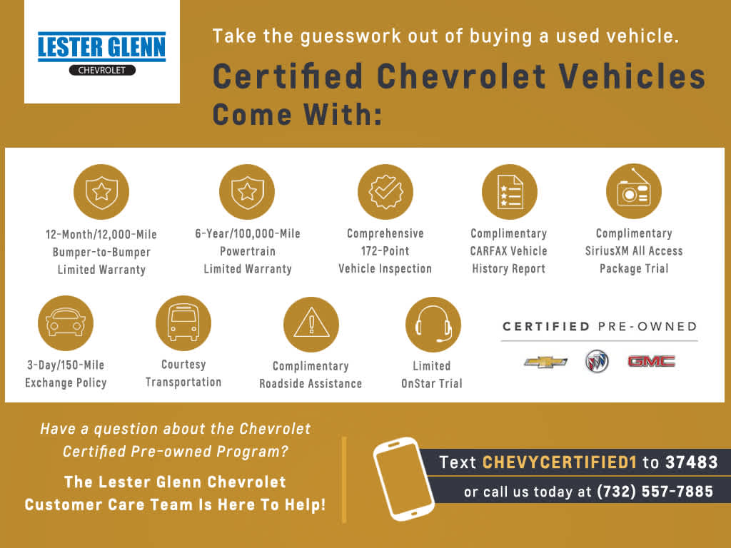 EXPERIENCE THE WAY CAR BUYING SHOULD BE. EXPERIENCE LESTER GLENN! Lester Glenn Chevrolet offers complimentary loaner vehicles and shuttle service while your vehicle is in for service with every pre-owned vehicle purchase! Call now for more details: (732) 240-8831. *Some Connected Services - INCLUDING Remote Start - May Require Subscription*