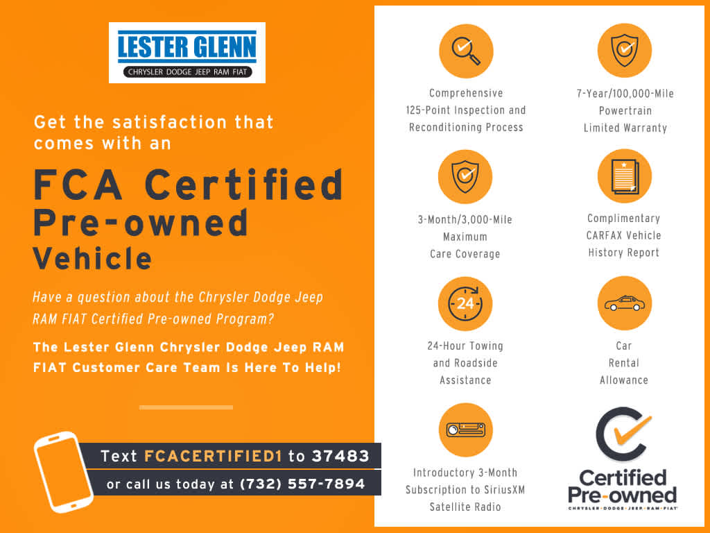 EXPERIENCE THE WAY CAR BUYING SHOULD BE. EXPERIENCE LESTER GLENN! Lester Glenn Chrysler Dodge Jeep RAM FIAT offers complimentary loaner vehicles and shuttle service while your vehicle is in for service with every pre-owned vehicle purchase! Call now for more details: (732) 240-8832. *Some Connected Services - INCLUDING Remote Start - May Require Subscription*