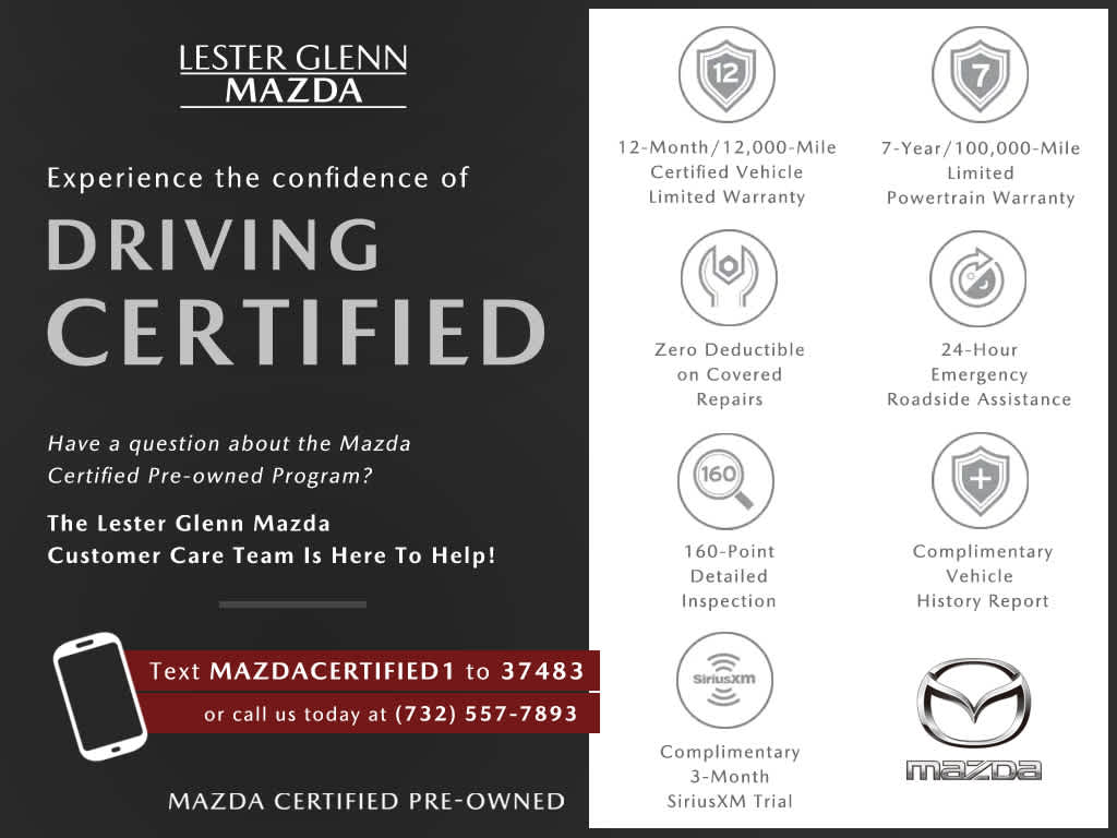 AutoCheck One Owner 160-point Inspection and Reconditioning by factory-trained technicians. Each Mazda Certified Pre-Owned vehicle is covered by any remaining portion, with no deductible on covered repairs. For Mazda CPO vehicles that are no longer covered by the, New Vehicle Limited Warranty, the CPO Limited Vehicle Warranty takes effect at time of purchase. 7-year/100,000-mile Limited Powertrain Warranty for additional peace of mind, 24-hour Roadside Assistance included during the warranty period and Extended Coverage Available, Every vehicle includes a free AutoCheck Vehicle History Report, Mazda Certified Warranties are transferable should you sell your vehicle, 3-month SiriusXM Satellite radio trial is included for all vehicles equipped with satellite radio