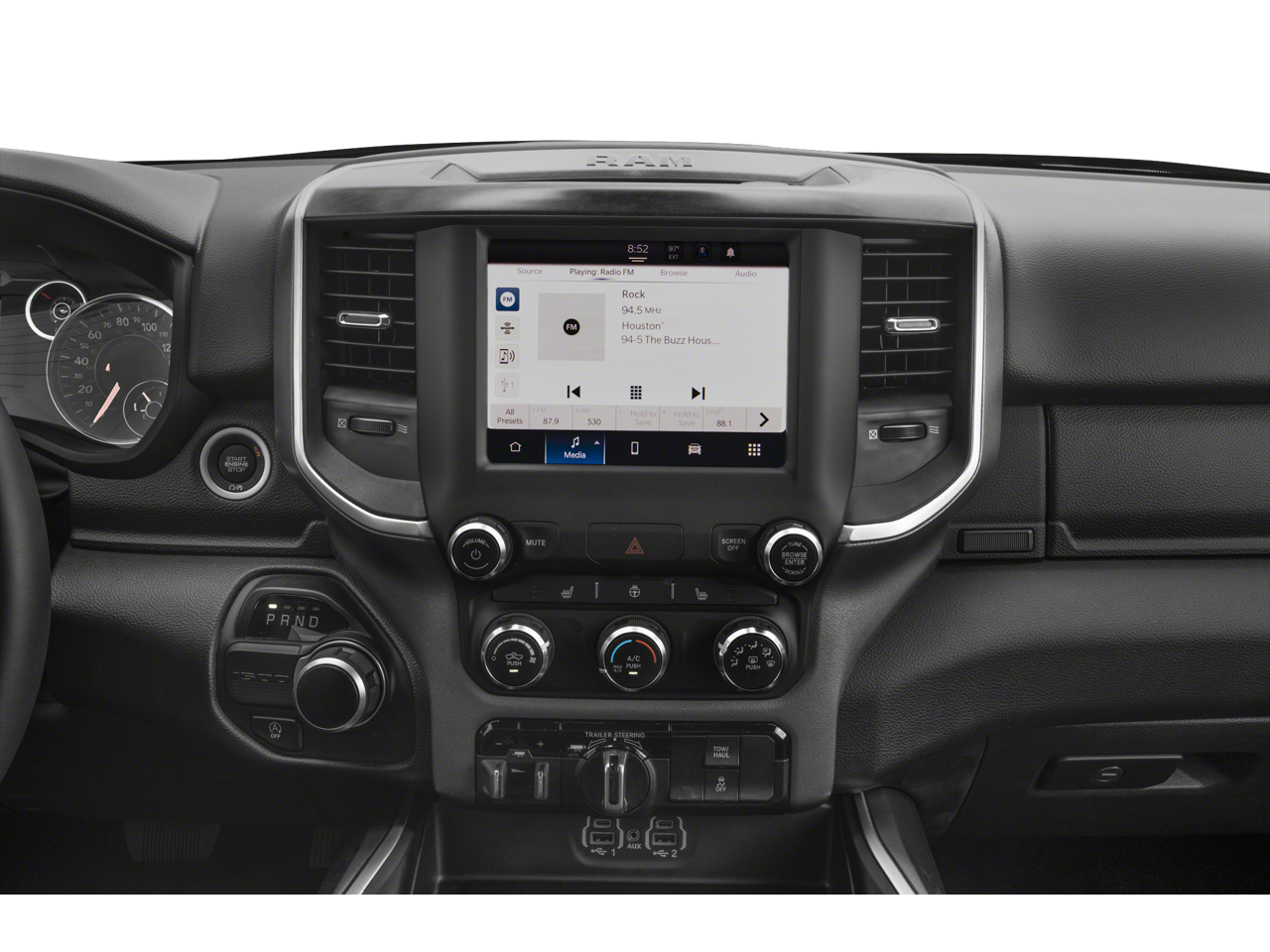 BIG HORN LEVEL B EQUIPMENT GROUP Rear Window Defroster, ParkSense Front/Rear Park Assist w/Stop, Rear View Auto Dim Mirror, Power Adjustable Pedals, Rear Power Sliding Window, Rear Dome w/On/Off Switch Lamp, Front Fog Lamps, Glove Box Lamp, Media Hub w/2 Charge Only USBs, Power 8-Way Driver Seat, Auto Dim Exterior Driver Mirror, Heated Front Seats, Heated Steering Wheel, Class IV Receiver Hitch, Security Alarm, Black Premium Power Mirrors, Big Horn IP Badge, Remote Start System, SiriusXM Satellite Radio, 400W Inverter, 9 Amplified Speakers w/Subwoofer, Radio: Uconnect 5 Nav w/12.0 Display, Google Android Auto®, SiriusXM Radio Service, USB Host Flip, HD Radio, For More Info, Call 800-643-2112, Connectivity - US/Canada, GPS Navigation, 4G LTE Wi-Fi Hot Spot, SiriusXM w/360L, All Radio, NIGHT EDITION Tires: 275/55R20 OWL All Season, Accent Color Premium Power Mirrors, Exterior Mirrors w/Supplemental Signals, Black Headlamp Bezels, Exterior Mirrors Courtesy Lamps, Auto Dim Exterior Driver Mirror, Black Exterior Truck Badging, Anti-Spin Differential Rear Axle, Wheels: 20 x 9.0 Premium Paint/Polished, Accent Color Door Handles, Grille Surround 1 Black Texture 2 Black, Black Interior Accents, Dual Exhaust w/Black Tips, Power-Folding Mirrors, Body Color Front Bumper, Body Color Rear Bumper w/Step Pads, RAM Grille Badge - Black, Black Painted Exterior Mirrors Caps, TRANSMISSION: 8-SPEED AUTOMATIC (8HP75) (STD), ENGINE: 5.7L V8 HEMI MDS VVT ETORQUE (STD), BLACK, DELUXE CLOTH BUCKET SEATS Power 8-Way Driver Seat, Bucket Seats, Manual Adjust 4-Way Front Passenger Seat, Full Length Floor Console, Rear Center Armrest, Power 2-Way Driver Lumbar Adjust. Ram Big Horn with Billet Silver Metallic Clearcoat exterior and Black interior features a 8 Cylinder Engine with 395 HP at 5600 RPM*.